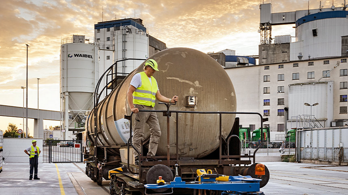 Mit dem Einzelwagen die nötige Flexibilität anbietenMit den gleichen Sicherheitseinrichtungen kann solvadis auch zwei Tankcontainer auf einen Kesselwagen laden. Wolfgang Schül verweist mit Stolz auf die neue und erweiterte Umschlagsfläche: „Auch Kunden ohne Bahnanschluss können, als reine Dienstleistung, einen Bahnkesselwagen nutzen.“ Ein Angebot, das stark nachgefragt wird. Sind die Kesselwagen beladen, werden sie noch am gleichen Tag von einer Rangierlok abgeholt. In der nächsten Zugbildungsanlage speist DB Cargo sie mit Wagen gleicher Richtung in den Güterwagenverkehr ein. Das entscheidende Argument bei solvadis für die Schiene: die Flexibilität des Einzelwagenverkehrs.