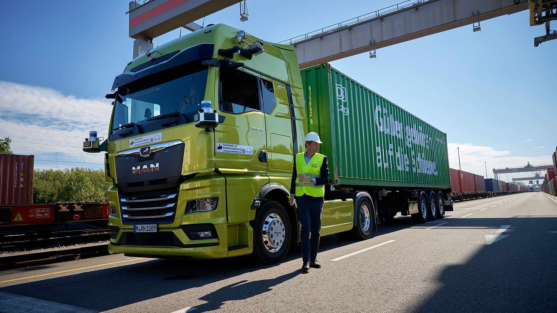 Es war ein Mammutprojekt, das über drei Jahre lief. Neben viel Vorbereitungszeit und der Entwicklung eines digitalen Kommunikationssystems standen sechs Monate Praxiseinsatz auf dem Programm. Dafür haben die Projektpartner einen autonom fahrenden Lkw entwickelt, der Containerverladungen selbstständig mit Hilfe einer digitalen Missionsplanung erledigen kann. Und zwar nicht nur als allein fahrender Lkw im Container-Terminal, sondern digital in den Logistikprozess eingebunden, um die möglichen Vorteile autonom fahrender Lkw möglichst auszuschöpfen. Die Testfahrten wurden dabei mit Sicherheitsfahrern und Entwicklungsingenieuren durchgeführt und brachten besonders in zwei Punkten wichtige Erkenntnisse: einmal für die stetige Verfeinerung der autonomen Fahrfunktion der Lkw und dem Zusammenspiel mit der Missionsplanung sowie für die erforderliche Vorbereitung der Terminals, um die Vorteile im täglichen Einsatz ganzheitlich nutzen zu können.