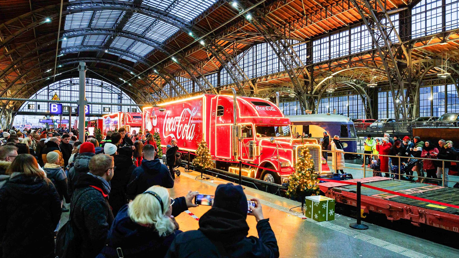 Rückblick auf die Weihnachtszug-Tour des letzten Jahres: Besucher erleben den legendären Coca-Cola Truck und bekommen Einblicke in klimafreundliche Schienentransporte von DB Cargo.
