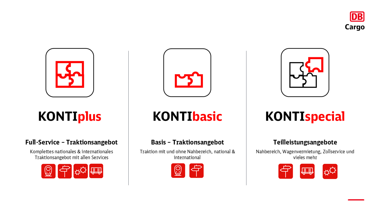 Die KONTImodal - Produktlogik bündelt die Leistungen zu fließenden, praxisnahen Lösungen: Full-Service-Lösungen für komplexe Transportketten, reine Traktion und Teilleistungen wie Nahbereich, Wagenvermietung oder Zollservices. Auf diese Weise erhalten Kunden maßgeschneiderte, planbare Transportlösungen, die national wie international funktionieren.