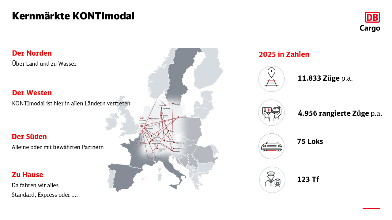 Mit der laufenden Umstrukturierung, der klaren Organisations- und Produktionsstruktur sowie der KONTImodal-Produktlogik gestaltet DB Cargo den kontinentalen KV – KONTImodal effizienter, planbarer und kundenorientierter. Züge rollen zuverlässig von Terminal zu Terminal, Abläufe sind stabil, und die Kunden erhalten maßgeschneiderte Lösungen aus einer Hand – praxisnah, transparent und Schritt für Schritt umgesetzt.