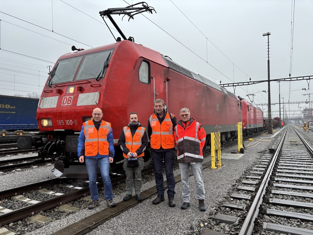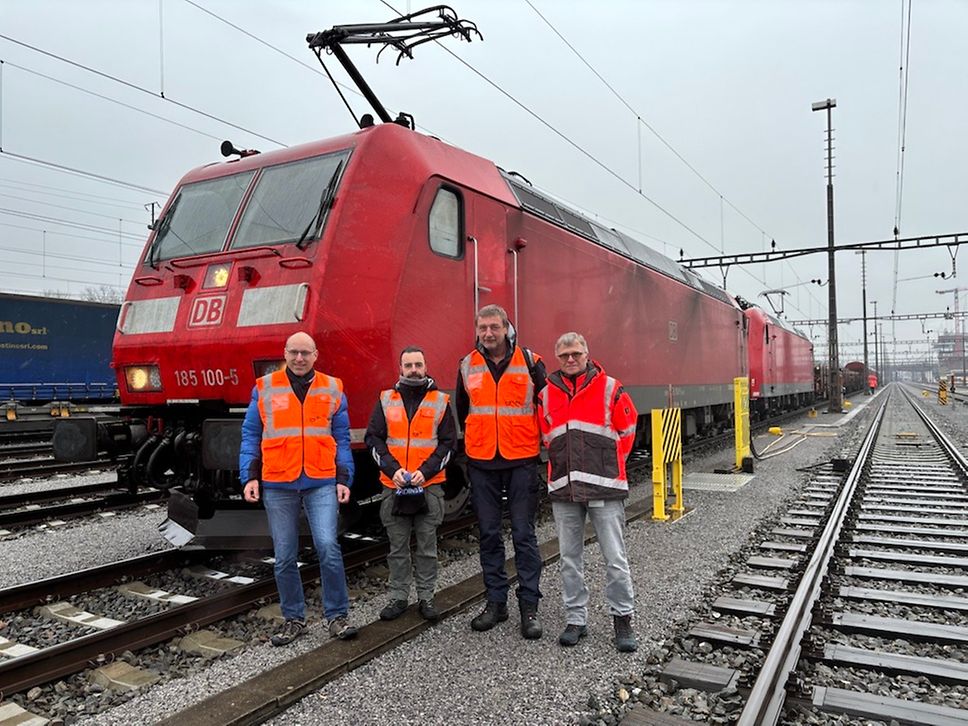 DB Cargo Switzerland employees in front of a locomotive: jointly responsible for end-to-end single wagon transit on the north-south axis between Germany and Italy (from left to right): Daniel Knaus, Loris Bacchetta, Thomas Jedro, and Martin Brunner.
