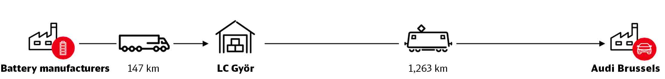 Pre-carriage of the battery modules involves transporting them by HGV to the logistics centre in Győr, almost 150 kilometres away. There, they are transferred to rail while being protected from the elements. The freight wagons then set off on the approximately 1,300 kilometre journey to Brussels – directly to the Audi plant, where a disused private siding has been put back in service specifically for this purpose. After the battery and cell modules are unloaded, the freight wagons return to Győr with the empty battery racks. There, the racks are loaded onto HGVs and taken back to the battery manufacturer – who fills them again with new battery modules and cells.